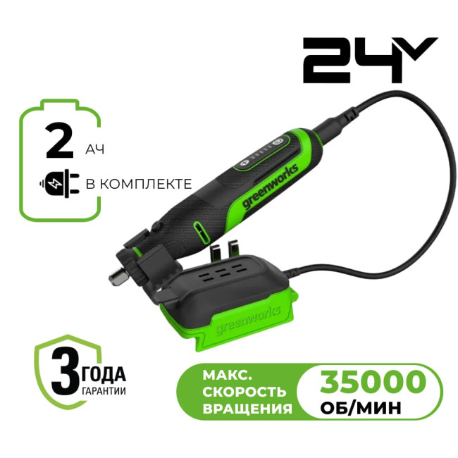 Greenworks G24RT — это универсальный инструмент, которые может использоваться для обработки керамики, фарфора, пластика, металла, стекла, стали, алюминия, ракушек, латуни, эпоксидной смолы, кокоса, нефрита, камня, пластилина, ореха, кости, дерева и т. д.