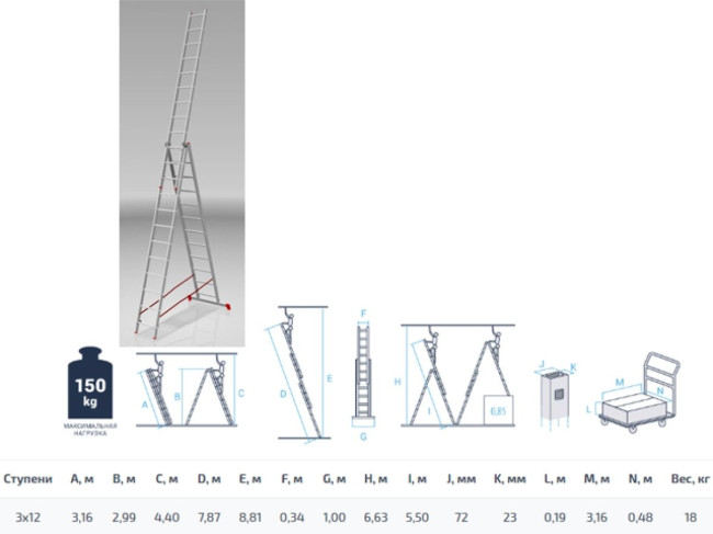 Лестница алюм. 3-х секц. 299/787/316см 3х12 ступ., 18,0кг PRO STARTUL (ST9942-12)